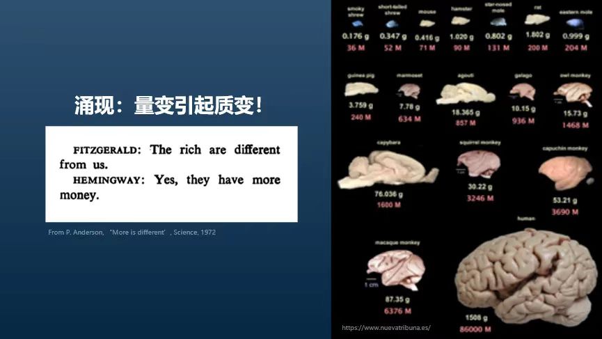 此外,我们有“涌现”的概念,即量变引起质变。以人类大脑为例,尽管我们的大脑结构与动物相似,但由于体积的差异,这种量变最终导致了质的飞跃。