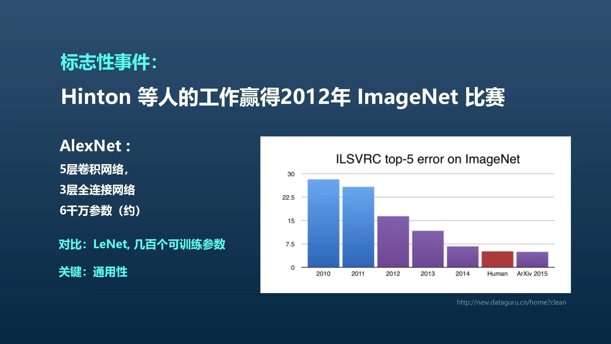 辛顿等人提出的AlexNet是一个由5层卷积层和3层全连接层组成的网络,拥有6000万个参数,这与之前用于识别手写数字的几万个可训练参数的LeNet网络相比,差距巨大。看到这个结果后,我的第一个想法是“或许我们能做得更好”。我甚至还和学生写了一篇文章,试图提出更好的技术路线。但后来发现这是徒劳的,因为我意识到,深度学习的方法不仅适用于图像识别,还具有通用性,可以用于其他任务,这也是现在深度学习如此广泛的原因。