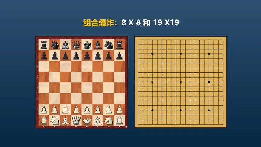 对比国际象棋和围棋的棋盘可以发现,从国际象棋的8×8棋盘,到围棋的19×19棋盘,可以组合的选择是呈指数型爆炸式增长的。因此,专家系统的套路在解决围棋的问题时就无能为力了。Deep Mind的创始人就是看了国际象棋比赛,才发现需要发展新的技术。