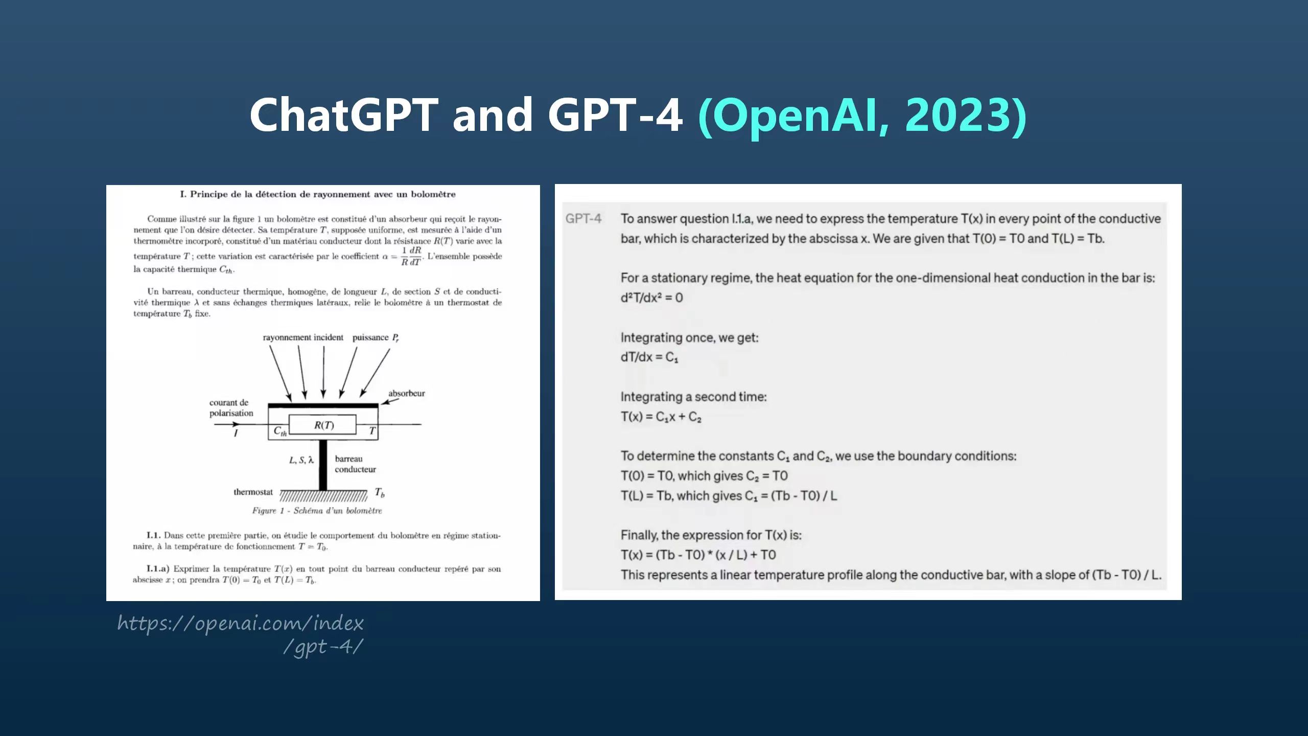 ChatGPT和 GPT-4的水平怎么样?我举一个例子:“计算一根棒子的温度分布”这个题目并不难(见下图),但GPT-4的解题方法让我感到很震惊:它先写出微分方程,再加入边界条件,然后解微分方程得出了结果。这其实和我的做法差不多,这让我感受到了很大的挑战。