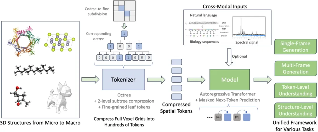 第二,建模任务不统一。3D结构相关任务可分为生成和理解两大类,但它们各自独立发展。生成任务多依赖扩散模型,从随机噪声逐步合成稳定结构,而理解任务则主要基于无监督预训练方法。相比之下,大型语言模型(LLM)已通过自回归方式成功实现了生成与理解任务的统一,但这种统一范式在3D结构建模领域仍然鲜有尝试。若能借助自回归方法统一3D任务建模,不仅有望打通理解与生成的界限,更可能将3D结构纳入多模态大语言模型的处理范式,继图像和视频之后成为 LLM可理解的新模态,为构建面向物理世界的通用多模态科学模型奠定基础。