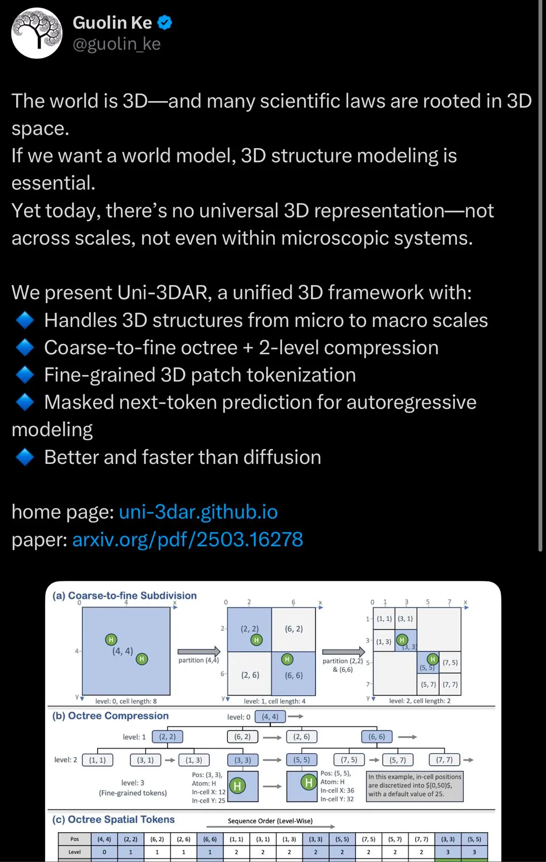 柯国霖在𝕏上分享表示:Uni-3DAR的核心是一种通用的粗到细token化方法(coarse-to-fine tokenization),它能将3D结构转化为一维的token序列。