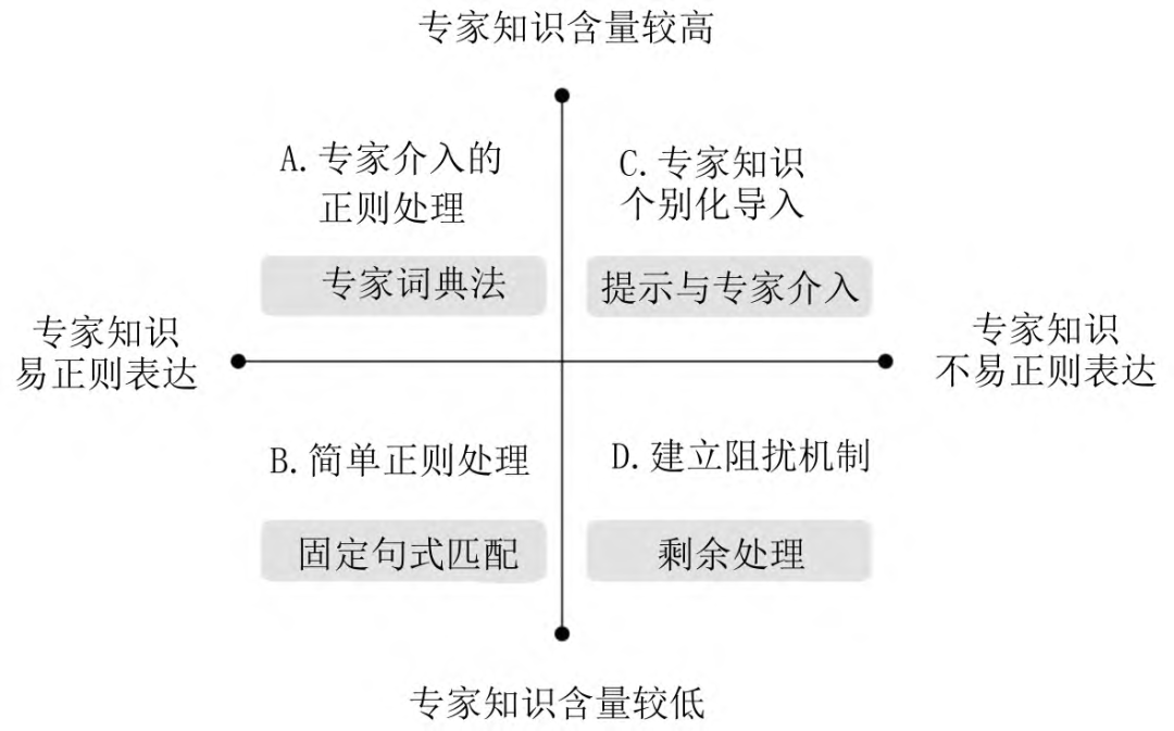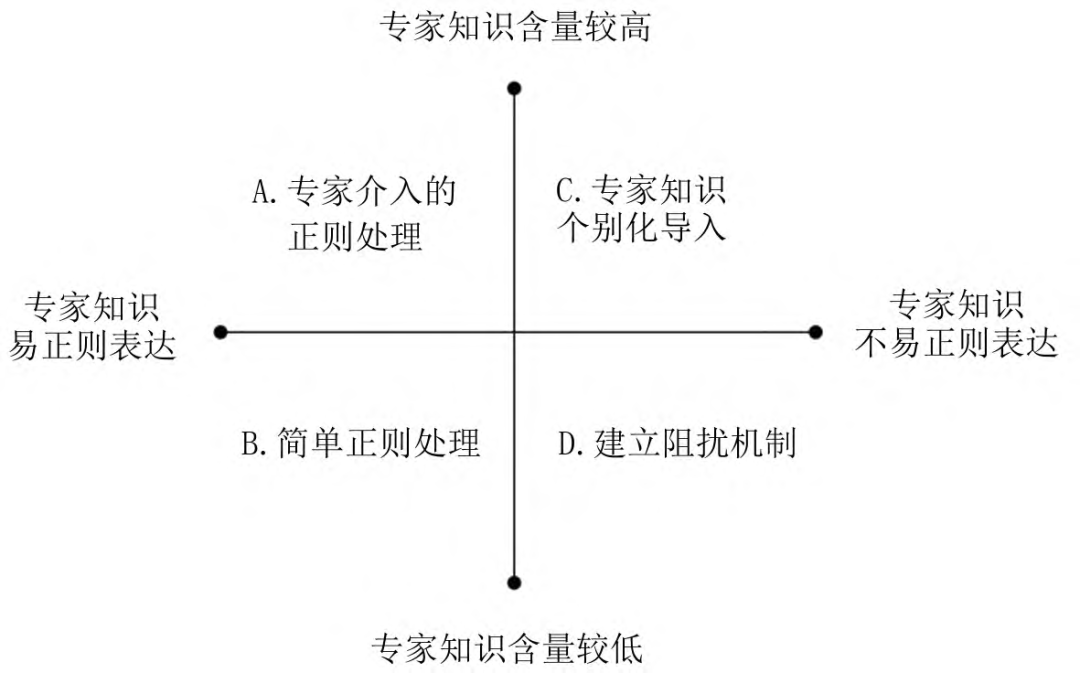 在框定专家知识的范围环节,研究团队强调要在这一过程中筛选出既有技术还无法自动实现数据化的专家知识,并充分外显这部分专家知识。在重构专家知识的结构环节,研究团队强调要在充分考虑技术实现可能性的基础上,构建尽可能反映专家知识原貌、减少专家知识损耗的形式化结构。在设计转化的技术路径环节,研究团队依据“专家知识含量”和“专家知识正则表达难易度”两个尺度,设计出了专家知识数据化的四类技术方法:专家介入的正则处理、简单正则处理、专家知识个别化导入、建立阻扰机制。
