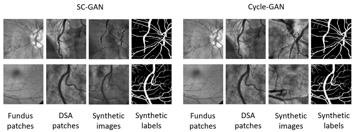下面是我们的SC-GAN方法一些实验结果。首先是图像合成的结果。跟SC-GAN相比,我们的方法合成的图像背景更加逼真,而且合成的血管也能够很好的与合成的标签相对应。