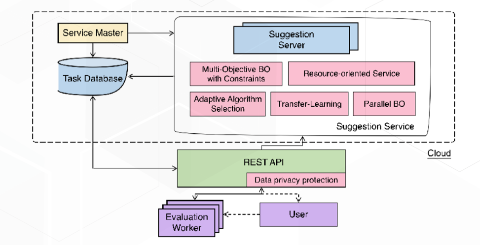 OpenBox是我们针对黑盒优化设计的一套开源系统,以贝叶斯优化为基础,高效求解黑盒优化问题。其使用场景广泛,不仅支持传统的单目标黑盒优化(如超参数优化),还支持多目标优化、带约束条件优化、多种参数类型、迁移学习、分布式并行验证、多精度优化等。OpenBox不仅支持本地安装与优化调用,还提供在线优化服务,用 户可通过网⻚可视化监控并管理优化过程,也可以部署私有优化服务。架构图如下: