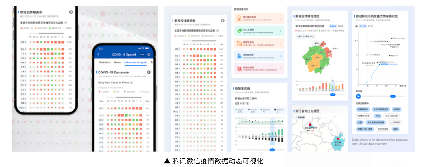 新型冠状病毒肺炎疫情可视分析:在2020年新冠疫情期间,针对疫情的发展变化,开展了有针对性的可视化工作,制作了全国各地的疫情变化晴雨表、各类疫情地图、疫情信息图表、相关社交媒体可视分析等可视化工具。其中,疫情变化晴雨表在2020年2月7日在腾讯微信医疗健康板块首次上线,应用于腾讯微信疫情数据动态可视化。相关工作还应用于中央广播电视总台(CCTV)视听新媒体中心,系统每天输出全国各省市新冠疫情数据可视化效果。