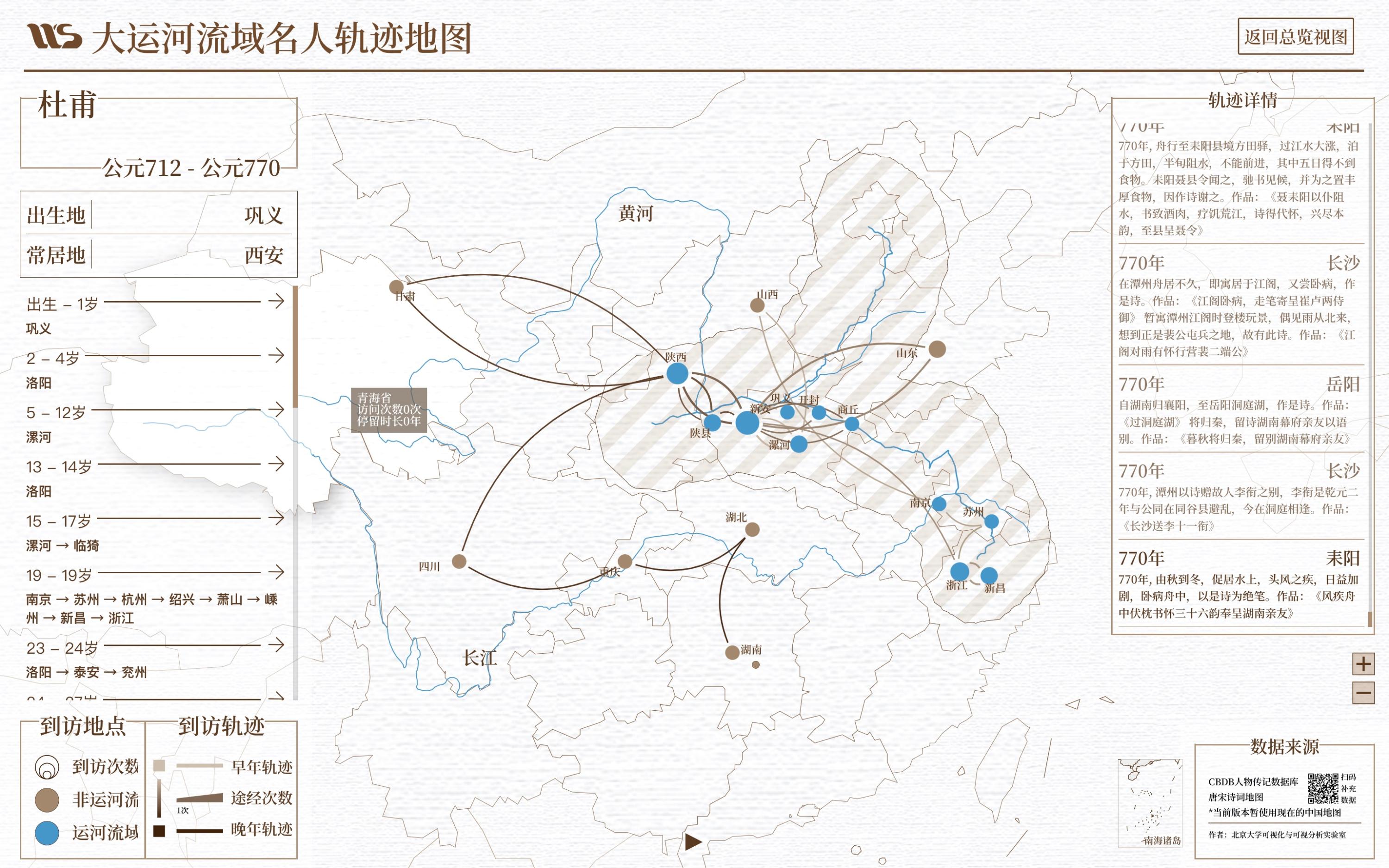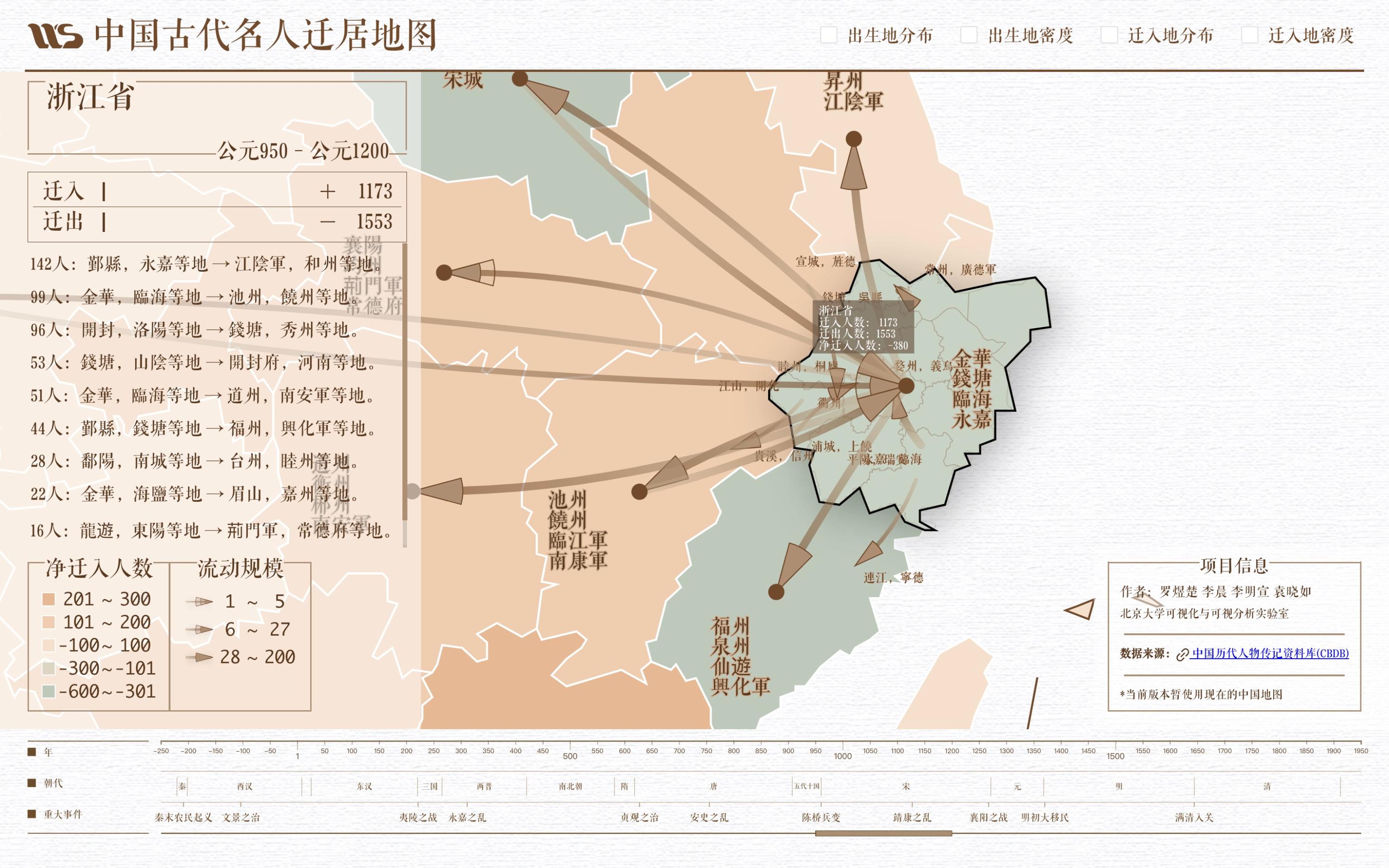 面向人文领域的可视化工具集:在实验室团队长期可视化方法研究的积累基础上,针对社科人文的需要,从表格多属性、网络、时空等多角度全方位研发构建了面向人文领域的可视化工具集。当前工具集已经包括历史人物时间线、空间迁移地图、历史名人轨迹、网络关系地图以及标注众包等工具系统,在与文学、历史、考古、管理等领域合作中实践应用。构建的可视化项目成果在中国可视化与可视分析古籍创意竞赛、IEEE数据可视分析竞赛等赛事中获奖,多次在国内国际艺术展中获邀参展。