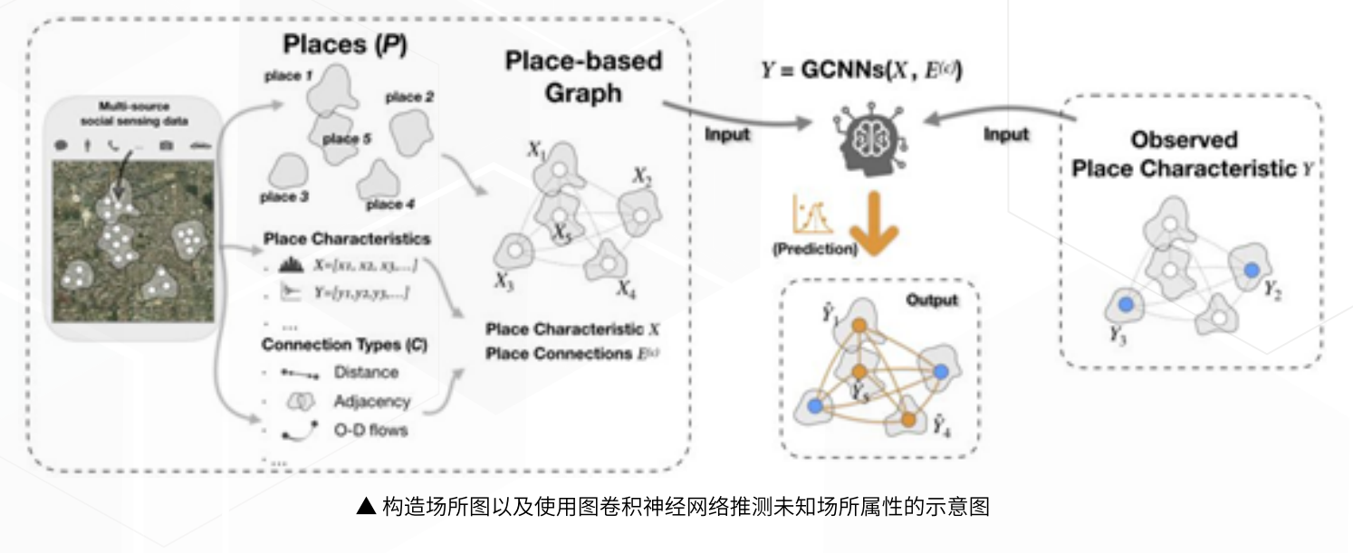 图卷积神经网络(GCNN)应用于不规则的地理空间分布的建模和推测:提出场所图(placebased graph)对复杂的场所属性和多源的场所连接进行形式化表达,通过训练图卷积神经网络(graph convolutional neuralnetwork, GCNN)实现地理空间回归 ,充分挖掘地理语境中场所属性的可预测性知识。本研究为不规则的地理空间分布提供了一种全新的神经网络建模思路,可以用于辅助评估空间模式,衡量城市 社会经济发展与人类活动的关系,进而指导城市规划和居民生活。论文于2020年1月正式发表于国际地理学旗舰刊物Annals of the American Associa tionofGeographers。