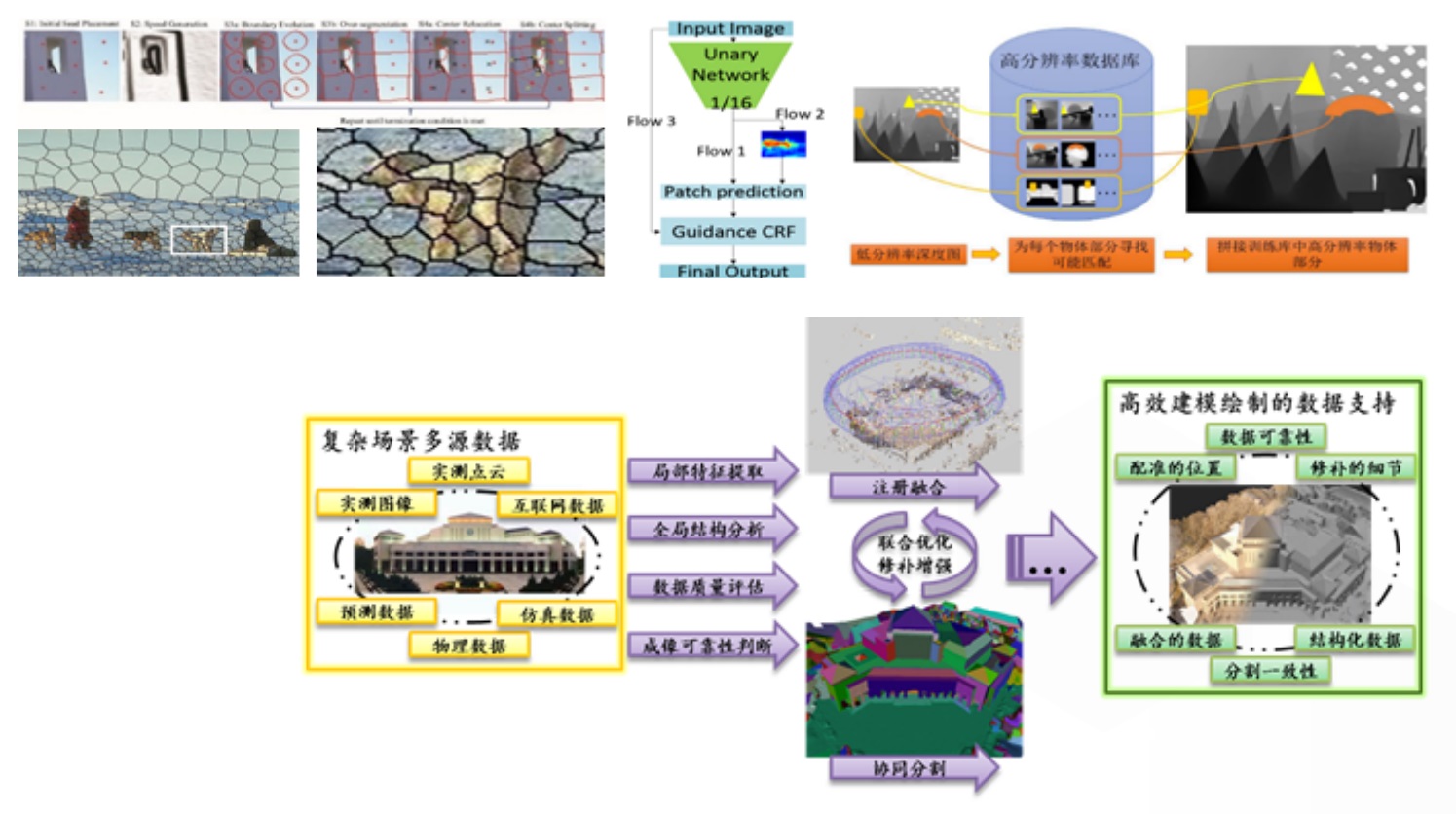 基于结构分析的场景建模:针对场景建模和绘制在鲁棒性、精度和计算效率方面的问题,从加强输入数据的类型、规模和质量入手,研究来自实测和社会的多源异构场景数据的结构化分析方法,引入仿真、预测、物理数据,挖掘在布局、构成、形变和互动等方面更多的结构约束,探索多源数据协同分割和语义识别方法。该尝试在统一的理论框架下表达数据融合、分割识别和几何重建的研究目标,有助于对问题形成更全面和完善的理解,并在理论上保障算法结果的最优性,通过多源数据协同分割识别与几何模型的联合优化提高结构分析和场景重建的一致性,更好地支持数据驱动智能化场景建模和绘制。