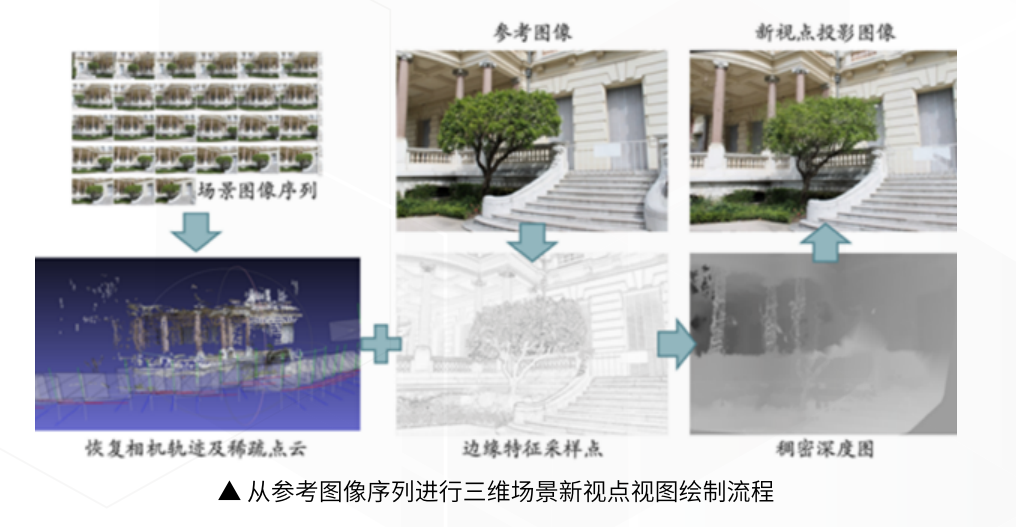 基于图像的三维场景高效建模与绘制:以通用相机获取的场景参考图像序列为输入,结合重要性采样等方法,充分利用参考图像中的颜色、纹理、边缘等特征,将稀疏的深度信息在图像平面上进行传播,从而快速、准确地恢复出稠密深度图像。在此基础上实现了在任意新视点下快速生成照片真实感新视图的方法。该方法仅需利用普通相机拍摄参考图像,对输入设备和数据具有更少的限制,应用范围也更广泛。