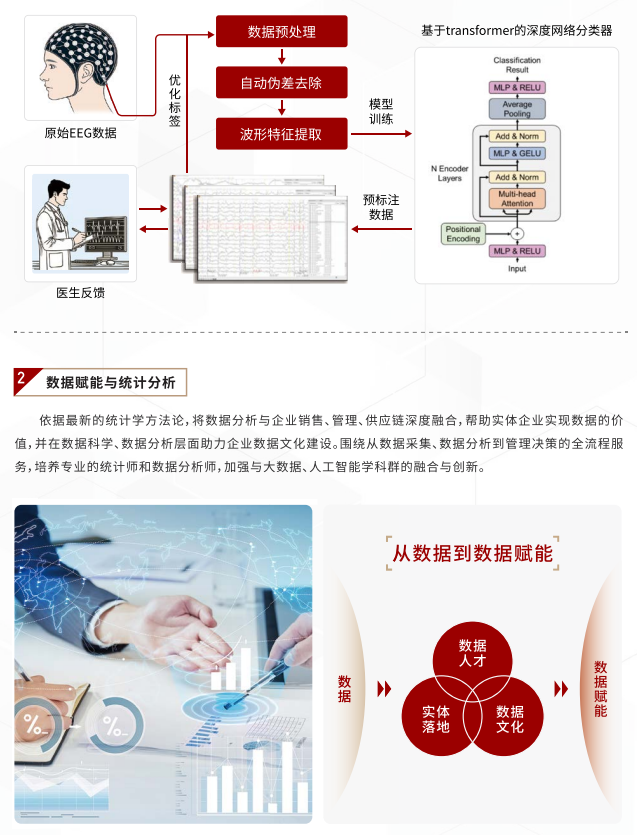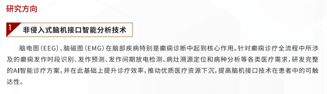 中心旨在推动脑科学和应用统计两个领域的科研成果转化和落地。脑科学领域聚焦于非侵入式脑机接口技术、分析算法和采集设备的研发和推广,以癫痫的人工智能辅助诊断为出发点,积极探索痴呆、抑郁、睡眠等领域的关键需求和解决方案。应用统计领域旨在打通从数据到数据赋能之间的分析瓶颈,挖掘数据中隐含的生产力,重点关注粮食安全、能源安 全、低碳环保和先进制造行业的数据科学服务,打造典型案例助力数字中国建设。